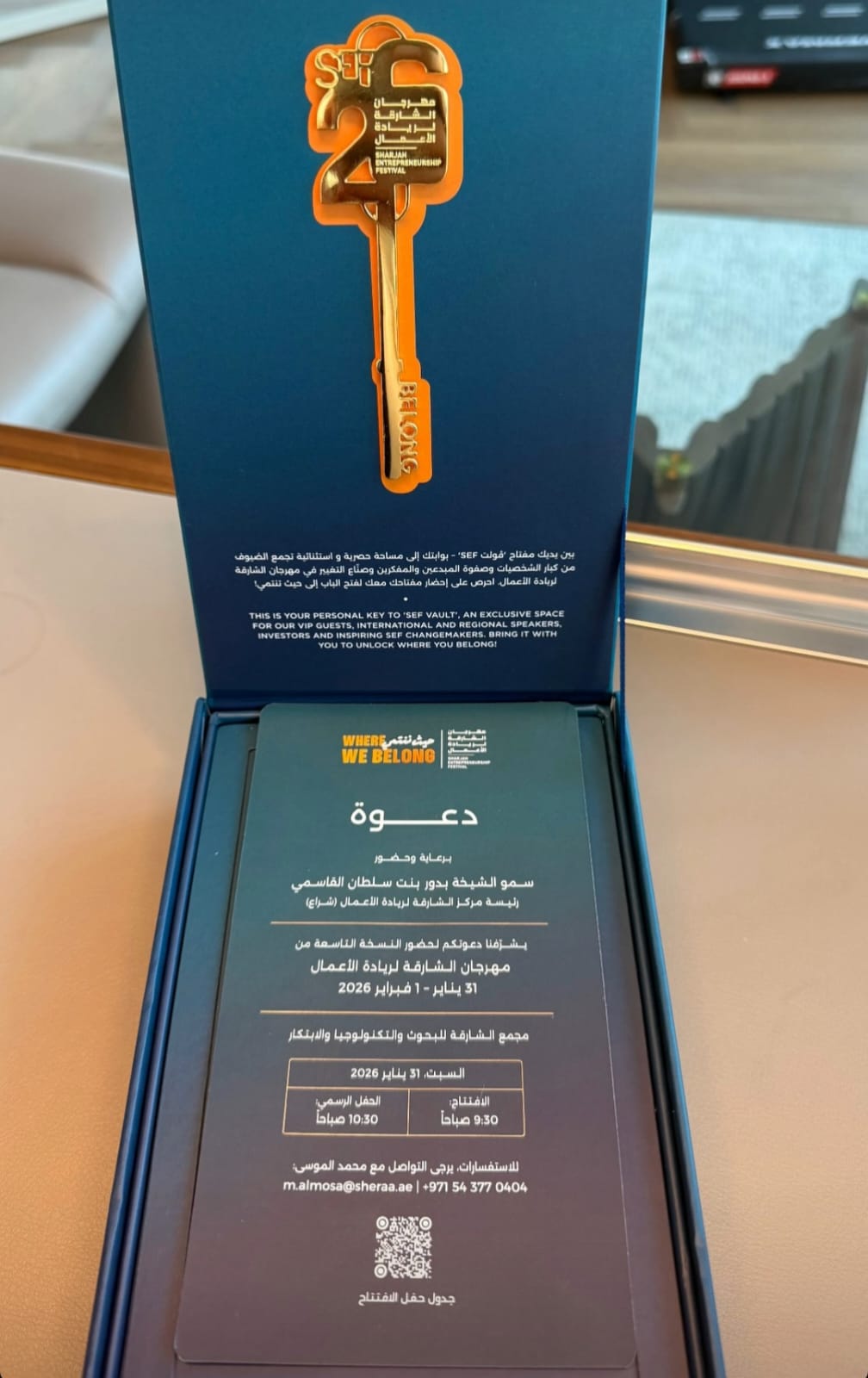 ويأتي هذا التكريم ضمن فعاليات مهرجان الشارقة لريادة الأعمال (SEF26)، الذي يُعد من أبرز المنصات الإقليمية والدولية في مجال ريادة الأعمال، حيث يجمع أكثر من 14,000 مشارك من رواد الأعمال والمستثمرين وصنّاع القرار، إضافة إلى 300 متحدث دولي و250 جلسة وفعالية متنوعة تشمل مؤتمرات ملهمة، وورش عمل تخصصية، ومنصات للابتكار، ومساحات للتواصل وبناء الشراكات.